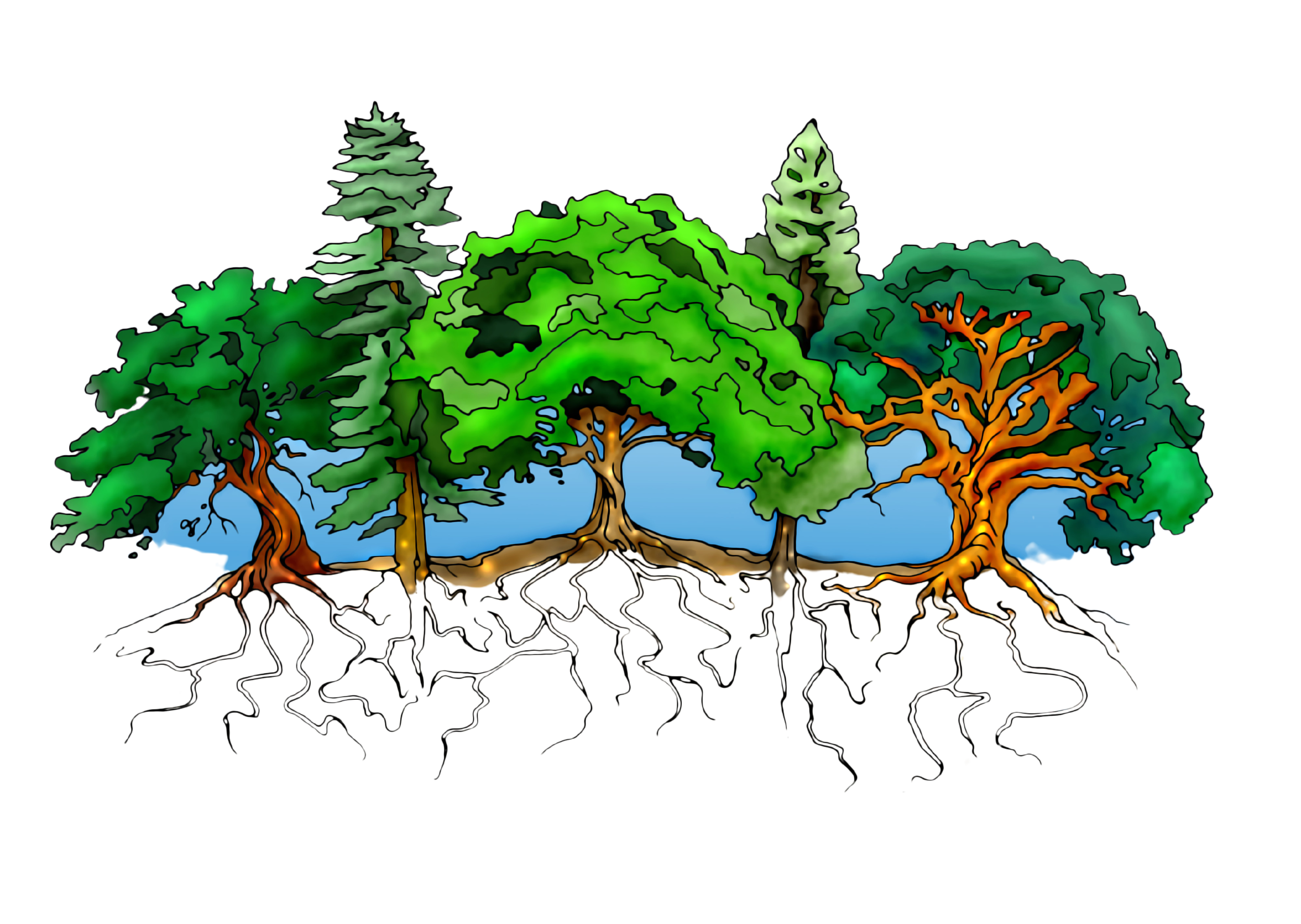 Trees communicate with other trees through their mycorrhizal network. The birch (left) and fir (right), are able to share food or signal each other in times of stress.